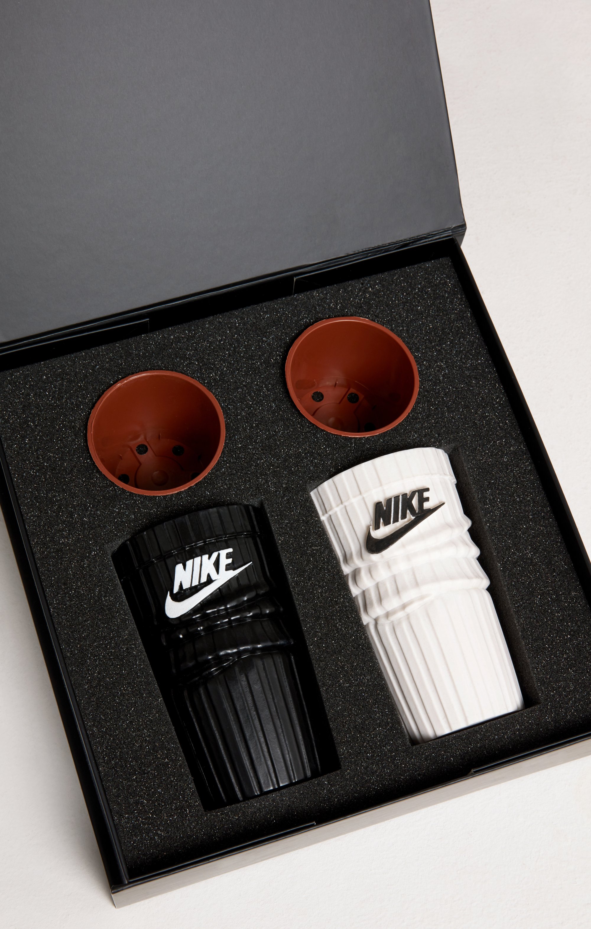 A functional sculptural object that merges plant life with everyday garments, reimagining domestic essentials through a design-led lens. The work balances humour, familiarity, and form — transforming ordinary objects into considered, collectible pieces. The Sock Planter draws from the language of the Nike Sportswear Everyday Essential Crew Socks, translating a recognisable wardrobe staple into a sculptural planter. Cast in white resin with a matte finish and finished with a hand-painted black logo, the piece retains the visual identity of the original while shifting its function. Each edition is presented as a set of two sock planters — one white and one black — designed to sit within interior spaces as both object and utility. Part of the “Art of Living” series, the work reflects a core VMU principle: elevating the everyday into culturally resonant artefacts.